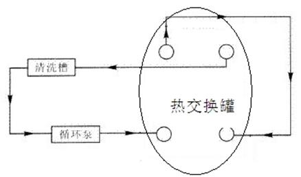 2、先將熱交換罐清洗介質(zhì)的進(jìn)出口閥門關(guān)閉,再將冷介質(zhì)的進(jìn)出口閥門關(guān)閉,排掉介質(zhì)。分別以冷熱介質(zhì)的進(jìn)水排污口為清洗液進(jìn)水口,出水排污口為清洗液出水口,按熱介質(zhì)進(jìn)口—熱介質(zhì)出口—冷介質(zhì)進(jìn)口—冷介質(zhì)出口的順序,和清洗泵、清洗槽、塑料管組成化學(xué)清洗循環(huán)系統(tǒng)和板式換熱器原理一樣,(如圖下所示)。